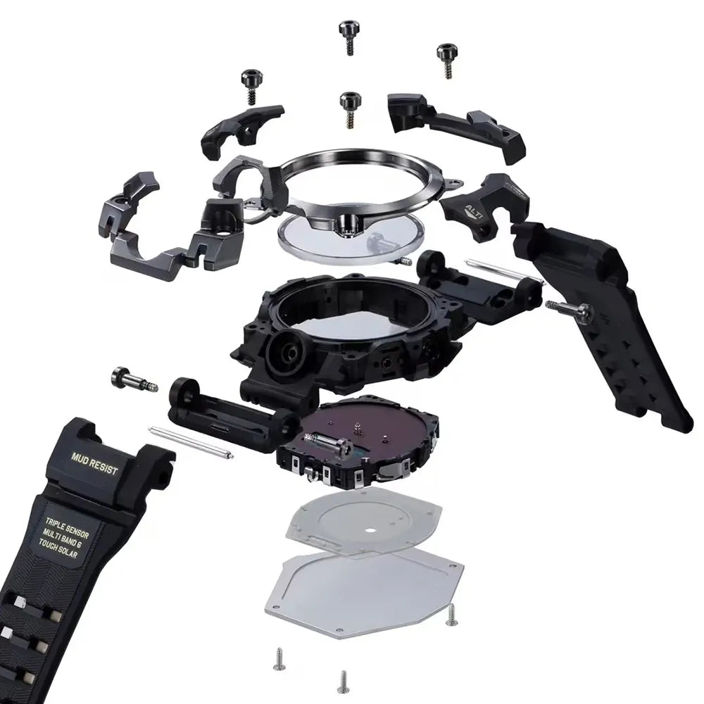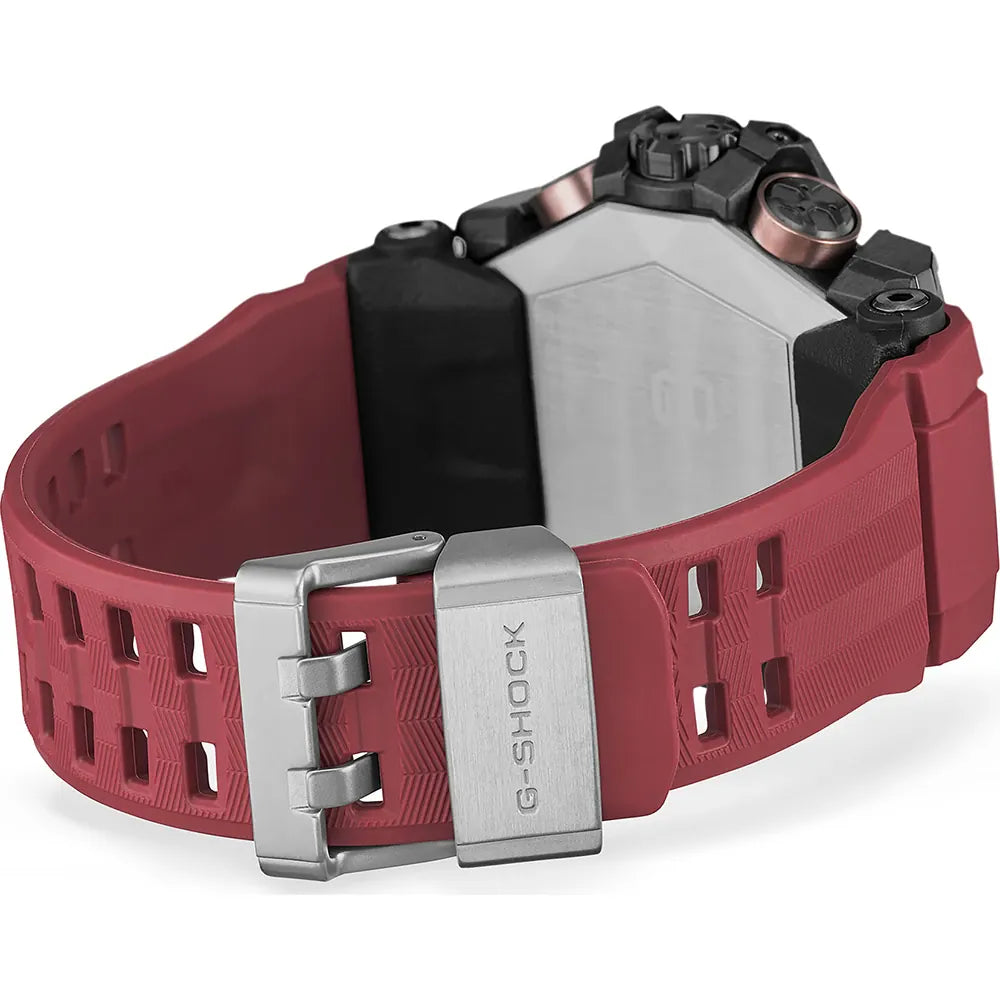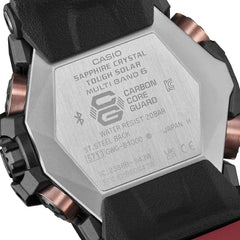 Questo orologio G-Shock presenta una cassa in acciaio inossidabile e carbonio con un diametro di 56 mm e un cinturino in resina. All'interno della cassa è alloggiato un movimento Casio di alta qualità protetto da un vetro zaffiro.